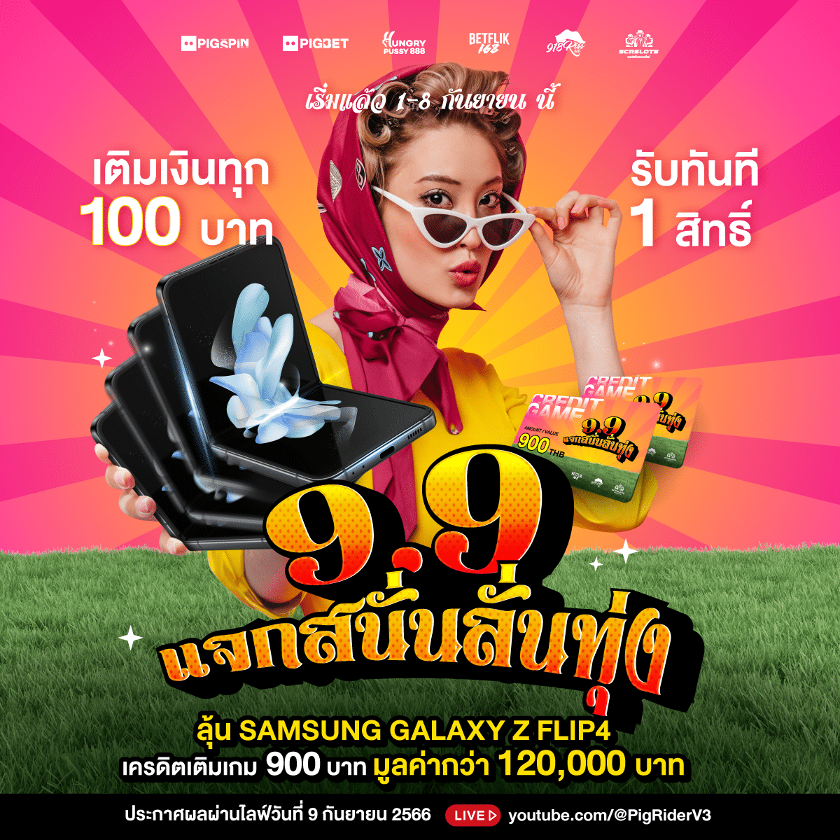ส่งต่อความชื่นมื่น กับกิจกรรมสุดปัง 9.9 แจกสนั่นลั่นทุ่ง ลุ้นรับ Samsung Flip 4 สุดคิ้วท์ และเครดิตฟรี เอาไปปั่นสล็อตให้มันส์สนั่นทุกค่าย!
